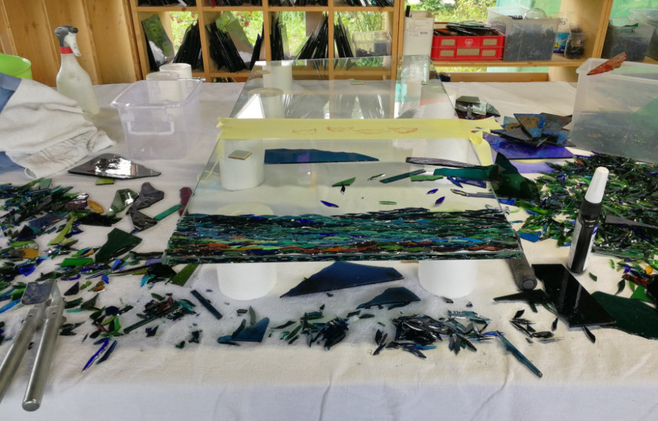 Wenn ich ein Glasstück gelegt habe, kann ich es nicht mehr wegnehmen, der unsichtbare Klebstoff ist fest, die Verklebung glasklar. Ein unsichtbarer Klebstoff bindet auch uns an dieses einmalige, kostbare Leben, in dem immer der aktuelle Moment der Wichtigste ist. Wir leben Schritt für Schritt, ich glase Scherbe für Scherbe. Und manchmal, wenn ich am Schluss ein Objekt von der Rück- oder Innenseite her, also spiegelverkehrt, betrachte, sehe ich: Der Verlauf der Scherben hat sich stimmig ergeben. Und ich frage mich, ist das Versöhnung?